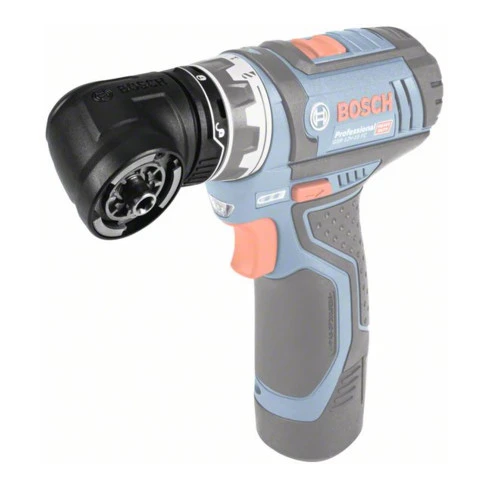 Adaptateur FlexiClick GFA 12-W; Redefine your limits – cinq fonctions avec un seul et même outil compact; Grande flexibilité : le GFA 12-W transforme la visseuse sans-fil en une perceuse-visseuse d’angle; Compatible avec GSR 12V-15 FC (0 601 9F6 …); L’interface « un clic » assure une fixation rapide et parfaite de l’accessoire sur l’outil. Tous les autres adaptateurs FlexiClick peuvent aussi être utilisés en combinaison avec l’adaptateur GFA 12-W (par ex. le mandrin interchangeable GFA 12-B); Conception compacte (longueur de tête : 61 mm) permettant un travail dans les endroits difficiles d’accès; Simple d’utilisation : le renvoi d’angle GFA 12-W peut être bloqué dans 16 positions (sur 360°) sans avoir à le retirer de la visseuse sans-fil