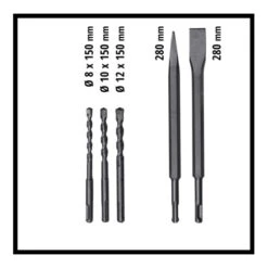 - La livraison comprenant trois forets (Ø 8, 10, 12 mm) ainsi que des burins pointus et plats est effectuée dans un coffret de transport et de rangement E-Box