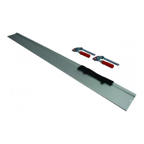 - Rail de guidage 1500 mm avec protection antidérapante sur la face inférieure, glissière en plastique avec vis, écrous et clé à six pans creux pour la fixation sur la plaque de guidage, 2 serre-joints à vis pour la fixation du rail de guidage sur la pièce.