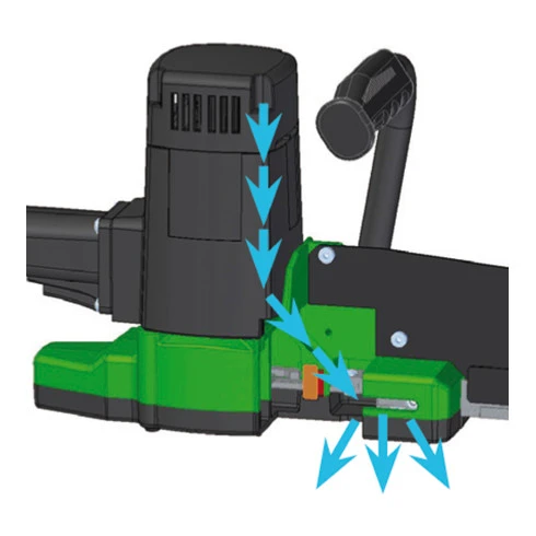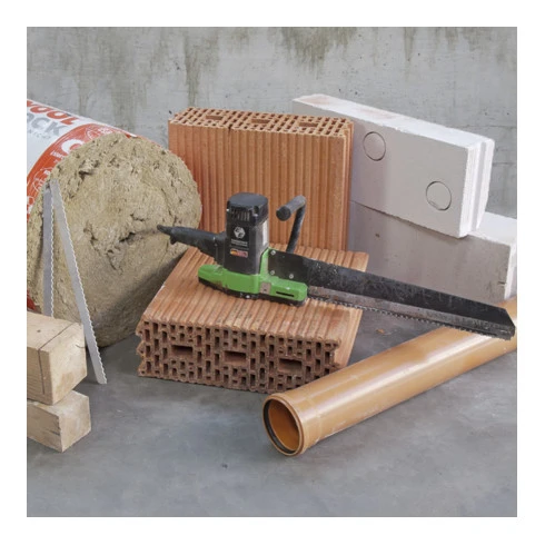 lame à l’épreuve de la torsion · pour scier sans recul · passage de la lame à travers la coupe · protection de la transmission et de l’utilisateur de la poussière · changement facile de la lame · pour découper les briques perforées (Poroton jusqu’à la classe de de résistance 20 avec lames de scie haut de gamme), béton cellulaire autoclavé, plastique, bois ainsi que matériaux isolants résistants à la pression · coupe en diagonale sans problème dans les briques perforées ·