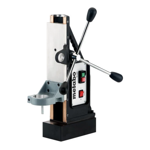 Pied magnétique à force magnétique élevée pour un travail en toute sécurité. Convient également aux travaux sur des surfaces obliques et verticales au-dessus de la tête grâce à la chaîne de sécurité fournie. Réglage en hauteur du coulisseau par pignon et crémaillère. La partie supérieure du support magnétique peut pivoter et se déplacer latéralement de manière à pouvoir amener la pointe du foret placé dans la perceuse au-dessus du trou de centrage pratiqué dans le matériau à percer.. Prise de courant pour la perceuse sur le support. Le support de perçage magnétique doit d’abord être allumé avant de pouvoir allumer la perceuse. Support pour compenser la force dégagée pendant le perçage. Bague graduée indiquant la profondeur de perçage. Peut être complété avec la perceuse B 32/3 pour obtenir une unité de perçage magnétique avec un diamètre de perçage max. de 100 m (foret pour avant-trou).